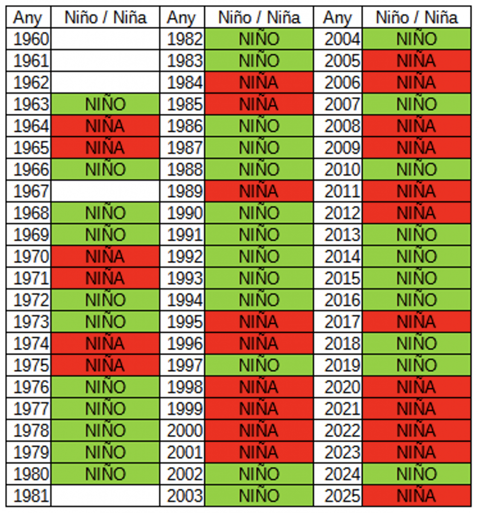 Fent l’exercici de mirar els anys que hi ha hagut El Niño i els anys que hi ha hagut La Niña al llarg dels darrers 60 – 70 anys, podem veure que hi ha una correlació entre els resultats de les carreres dels diferents anys i l’efecte d’un o altre fenomen.